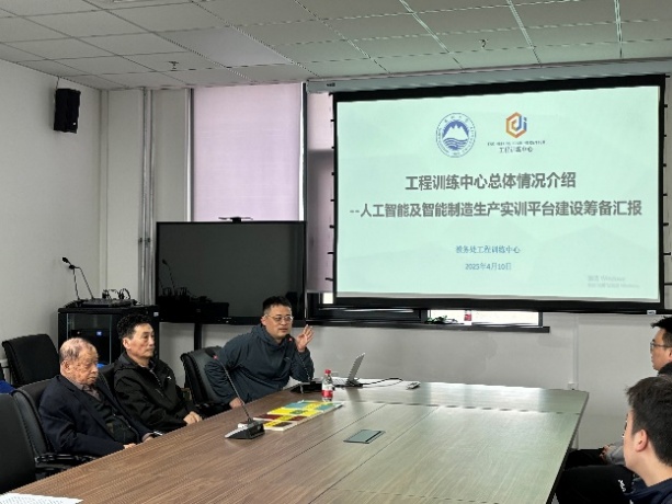 中心负责人通过专题汇报的形式系统展示了中心在“素质、知识、能力——三个维度梯度”实践教学体系构建、创新基地建设及学生团队培养等方面的成果,人工智能及智能制造生产实训平台建设筹备情况。