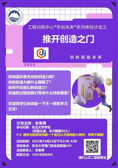 10月23日下午,为深入贯彻落实五育并举基地建设要求,全面提升学生综合素养,东北大学工程训练中心(以下简称“中心”)成功举办了“推开创造之门”主题智育沙龙。活动预告发布后,引发了同学们的广泛关注和热烈响应,报名踊跃。本次沙龙由史家顺老师主持。